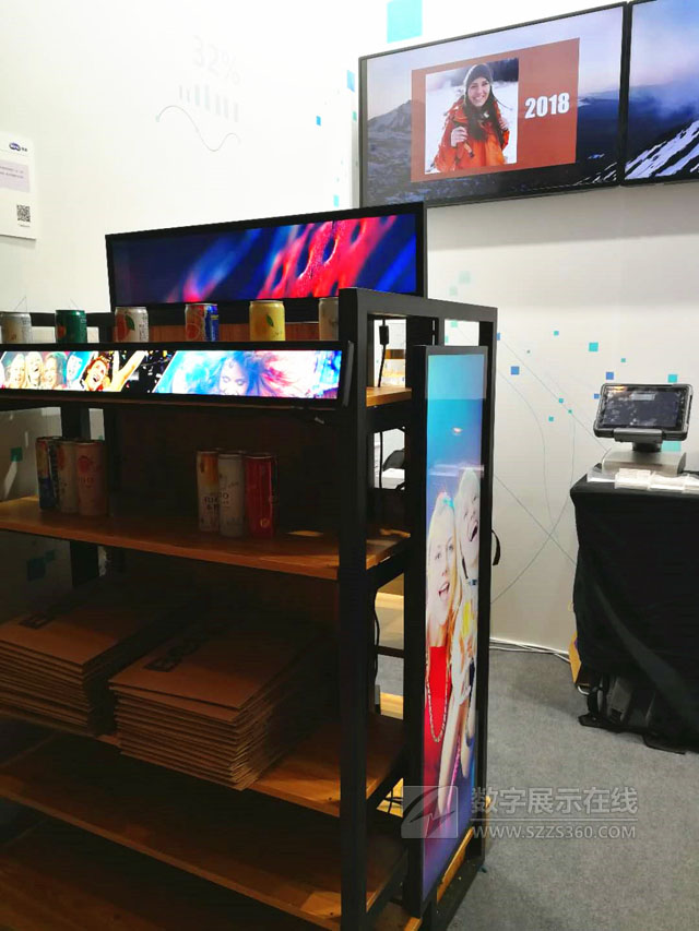 6平米的展位,位置不大卻五臟俱全,既看得見豐富多樣的顯示硬件,透過內容還能對智能軟件應用窺知一二。其中播放精彩內容的智能貨架最為矚目,區別于我們平常看到的貨架,緊貼商品擺放的條形屏能夠提供更多商品信息,還能增加品牌曝光。