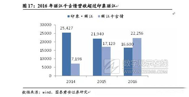 在宋城的大本營杭州,《宋城千古情》在2014年全國旅游演藝劇目票房排行中名列第一,而《印象西湖》未進入前10強;在麗江,2014年3月麗江千古情開業后業績增長迅速,開業第3年的營收就達到2.2億元,超過了在當地已運營近10年的印象麗江。值得一提的,兩大舞臺劇的正面交鋒,在一定程度上刺激了觀眾欣賞欲望,麗江的演藝市場正在快速擴容。