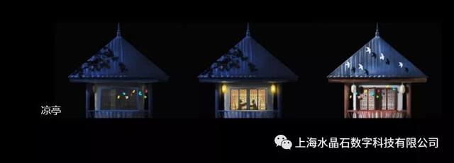 夜幕降臨,涼亭在燈光的投射中勾勒出真假難辨的建筑輪廓,室內隱約可見剪影的人形。隨著涼亭的旋轉,彩蝶飛舞、古人撫琴、斗轉星移的變幻營造出了涼亭穿越千年的禪意。