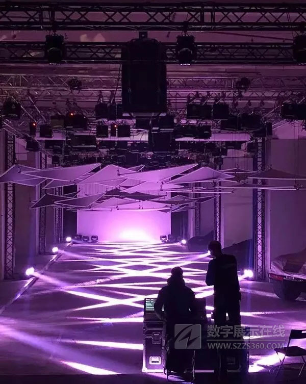 這場發布會的主要技術創新是專門為這個展會開發了軟件算法,計算所有56個動力學三角形的運動,使用直接從設計軟件獲得的數據,完成了驚人的表演。頂部動態升降系統控制56個三角板變化各種高難度動作,每個三角板用LED燈條包裹,由168條鋼絲懸掛控制,與周圍背景屏幕結合作為投影畫面介質。現場使用14臺投影機,3萬流明度,4K超清分辨率。