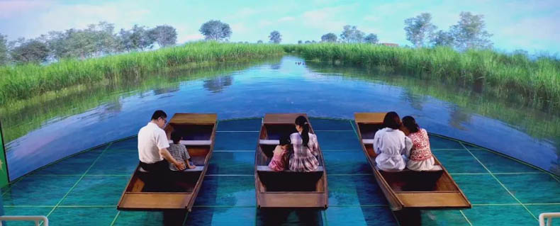位于主場館首層的“濕地漫游”互動展項頗受游客喜愛,展項以造景結合數字化展示效果呈現,通過150度LED弧形屏幕數字內容與安裝遙感器的機械船只營造4D沉浸體驗,使得觀眾穿行于蘆葦叢中,體驗白洋淀“河淀相連、蘆蕩蓮塘”的獨特景觀魅力。