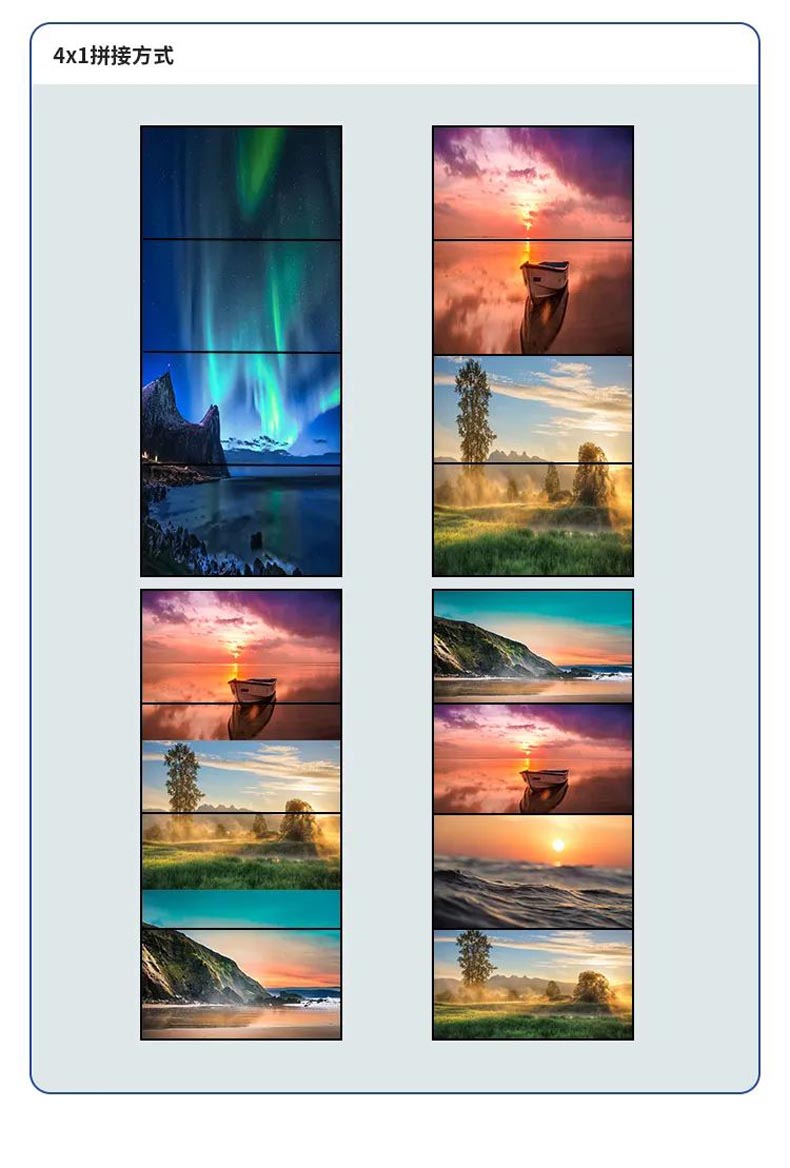 支持多種拼接模式,包括1*1、2*2、1*3、1*4等不同拼接模式,讓你根據實際需求進行靈活的畫面布局。無論是大屏幕拼接還是多畫面展示,它都能輕松勝任。