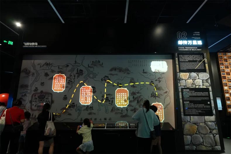 “飛鴿與快馬”、“文字與溯源”、“從模擬到數字”、“5G智慧之城”、“郵票與郵筒”、“郵遞員故事”、“肢體語言”、“萬物智聯”八個展項通過 DWU760-iS 投影機,系統呈現了通信技術從古至今的發展脈絡。