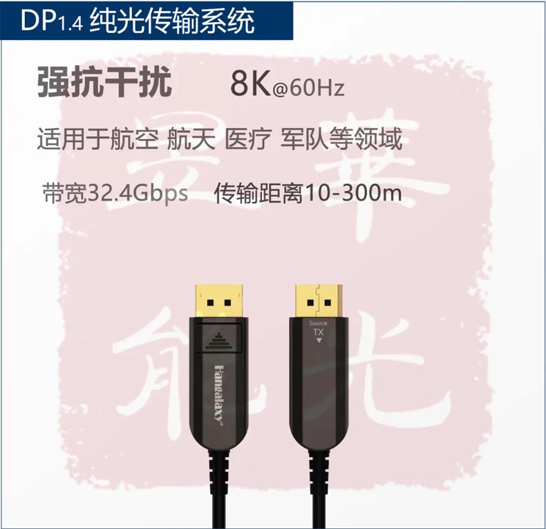 華光昱能Hangalaxy 品牌HDMI AOC/DP AOC專業工程有源光纖線將光學引擎等諸多光學器件及電子芯片、軟件進行高度集成為一體化傳輸系統,一條線可以無損傳輸4K/8K信號到300米,有效解決長距離傳輸鏈路穩定性問題。