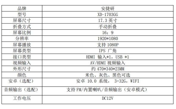 安捷研車載折疊顯示屏, 是一款功能強大的車載顯示設備。采用17.3 寸高清液晶顯示屏,分辨率高,色彩鮮艷,畫質清晰,能夠為用戶提供出色的視覺體驗。