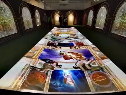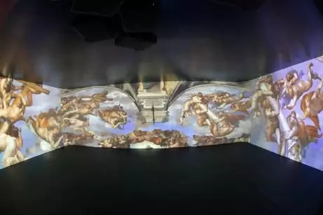 其中,世界最大的壁畫西斯廷教堂天頂壁畫在本次展覽中以前所未有的方式打開,通過實景還原西斯廷教堂,米開朗基羅兩大代表作《創(chuàng)世紀(jì)》和《最后的審判》被投影技術(shù)投射于墻面,行走在展廳長廊之中,宛如置身梵蒂岡宗座宮殿。