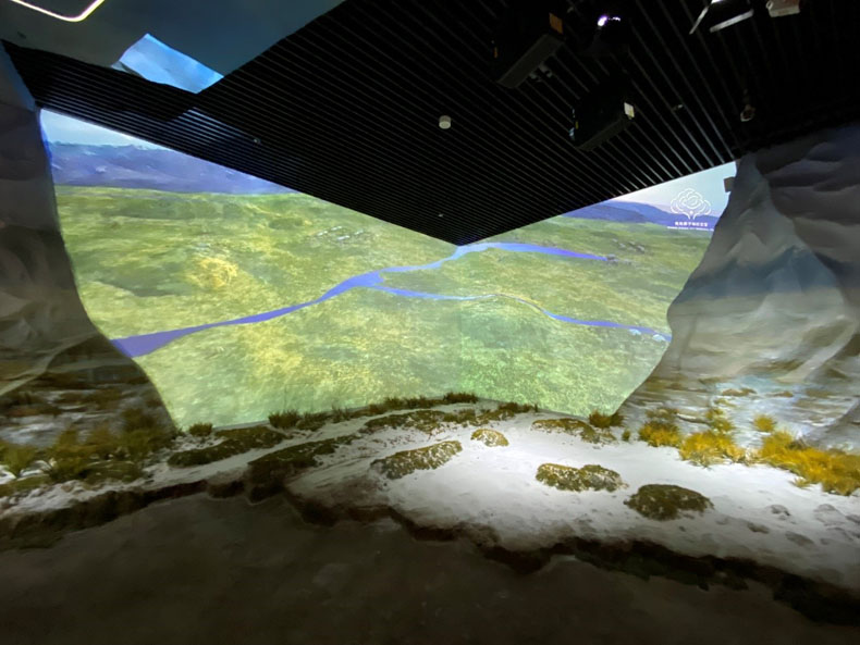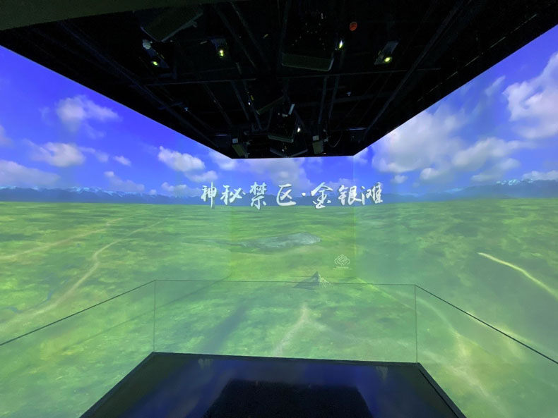 在《神秘禁區》方案中,12臺明基激光工程投影機分別對左、右、前、下四面幕布墻進行融合投影,站在中間觀賞,視野完全被投影所覆蓋,其畫面一移動,感覺人也在移動,從室內來到廣袤無垠的草原,探索藏在禁區內的核工業基地。