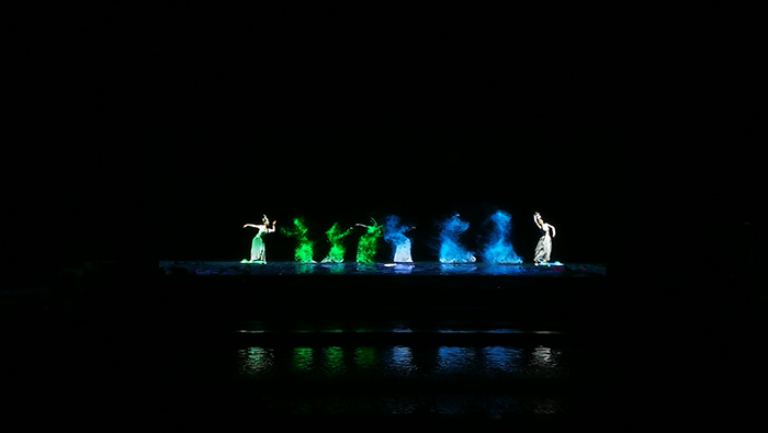 西湖相遇”環(huán)節(jié),根據(jù)宋城導(dǎo)演團隊的意見,在演出中增設(shè)了一段小精靈舞表演,致敬G20峰會文藝演出的《天鵝湖》表演片段。全息幻象和LED屏視角延展,呈現(xiàn)縱深感十足的舞臺視覺。