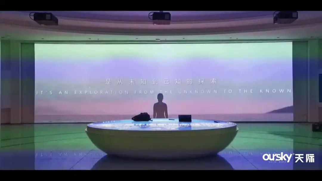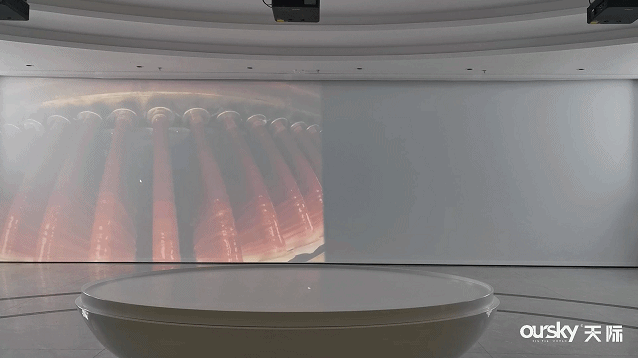 進(jìn)入展示大廳,在中控系統(tǒng)的控制下,中央的12米巨幅升降幕徐徐降下,營造出觀影的最佳光環(huán)境,隨后開始播放先導(dǎo)片,幫助參觀者建立起對行業(yè)的認(rèn)知。緊接著圓形區(qū)位沙盤臺被“點(diǎn)亮”,震撼影片播放,向參觀者呈現(xiàn)出企業(yè)區(qū)位及產(chǎn)品線,讓參觀者在滿滿科技感的氛圍下,瞬間進(jìn)入“貝利特”的世界。