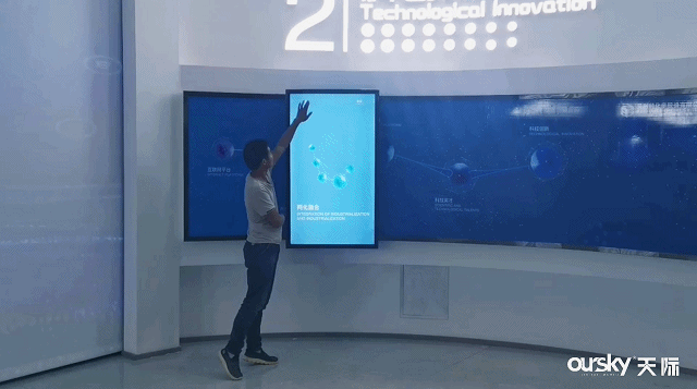 為了突出企業(yè)的科創(chuàng)成果和科研水平,我們打造具有交互性的滑軌屏展項(xiàng),動態(tài)式擴(kuò)展和延伸內(nèi)容,在有限的空間資源內(nèi)盡可能地展現(xiàn)更多企業(yè)“風(fēng)采”。