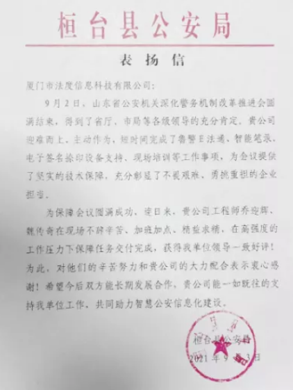 這一年,收到來自山東淄博桓臺縣公安局的表揚信。