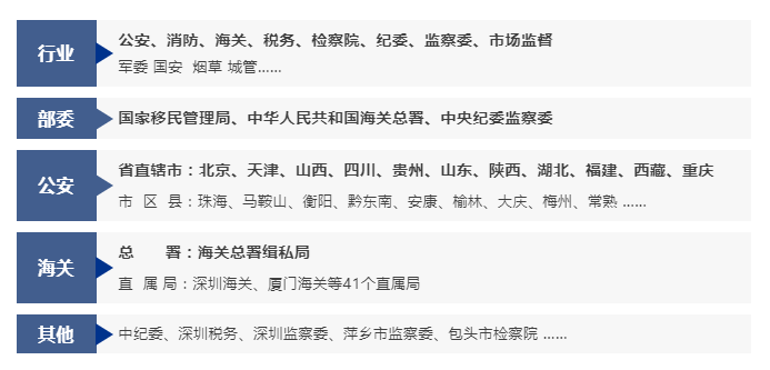 法度智能執法系列產品用戶涉及(公安、消防、海關、紀檢監察、市場監督、稅務稽查、檢察院等)7個行業,31個省(含免費)、2700多個地區、4萬多個基層執法單位,有70多萬基層執法人員使用。